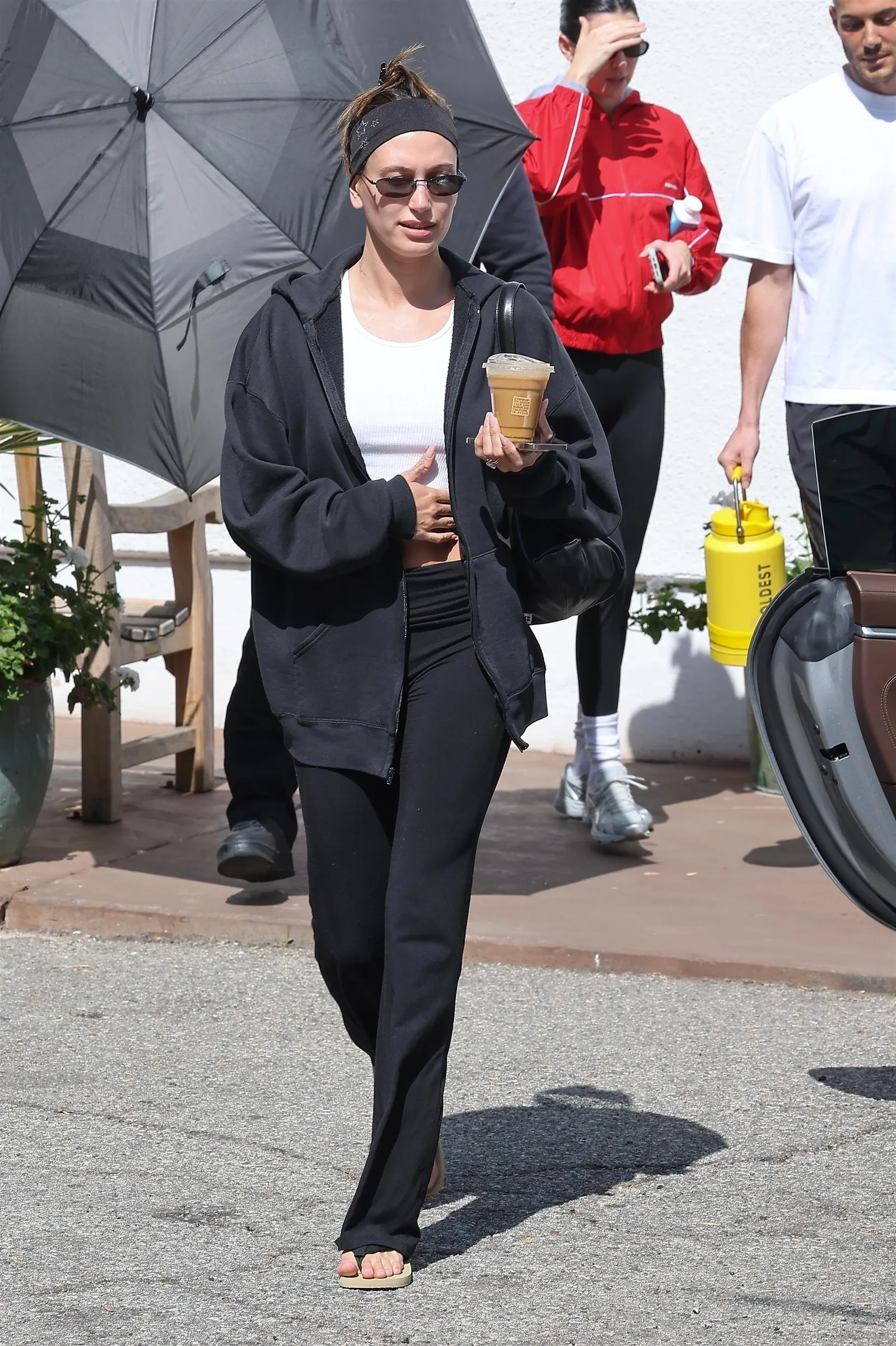 Bieber's workout outfit was similarly chic, and consisted of black yoga pants, a black zip-up hoodie, and a white crop top. The model wore a pair of Otra's Drew sunglasses, which are available to shop for $70, and Emi Jay's Big Effing Clip Hair Claw in Noir.